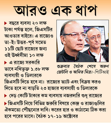 পরিষদের বৈঠকে কেন্দ্রের দাবি ছিল, বছরে ২৫ লক্ষ টাকার পর্যন্ত ব্যবসা জিএসটি-র আওতার বাইরে থাকুক। কিন্তু অনেক রাজ্য তাতে আপত্তি তোলে। চাপ দেয় তা কমাতে। শেষমেশ ২০ লক্ষের সীমা বাঁধা হয়। ১১টি ছোট রাজ্যের জন্য তা ঠিক হয় ১০ লক্ষ টাকা। এর ফলে পশ্চিমবঙ্গে সরকারি ভাবে নথিভুক্ত ২.৬৫ লক্ষ ব্যবসায়ী ও ডিলারের মধ্যে ১.৩৮ লক্ষ জিএসটি-র আওতায় পড়বেন না। দিতে হবে না পণ্য-পরিষেবা কর।