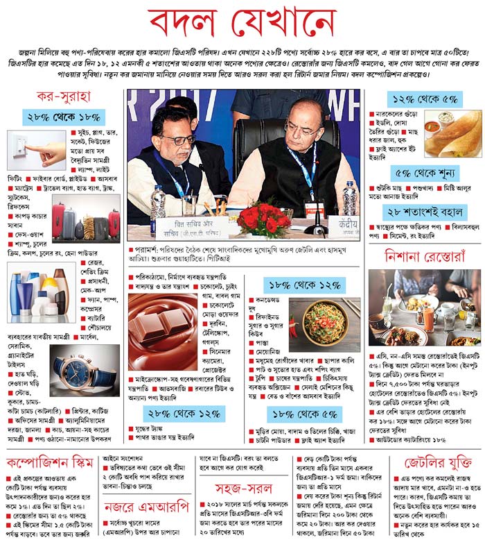জিএসটি-তে কর কমার সুবিধা ক্রেতাকে না-দেওয়া বন্ধ করতে কার্যত এটিই কেন্দ্রের প্রথম সিদ্ধান্ত। যদিও অরুণ জেটলি একে সেই তকমা দিতে রাজি নন। এত দিন বাতানুকূল রেস্তোরাঁয় জিএসটি ছিল ১৮%, না-হলে ১২%। ব্যবসায়ীদের অভিযোগ ছিল, অনেক রেস্তোরাঁয় কিছুটা বাতানুকূল, কিছুটা সাধারণ অংশ রয়েছে। কোন আনাজ বা রান্নার তেল কোথায় ব্যবহার হচ্ছে, কী ভাবে হিসেব রাখা সম্ভব? ১৮% জিএসটি নিয়েও অভিযোগ তুলেছিলেন তাঁরা।