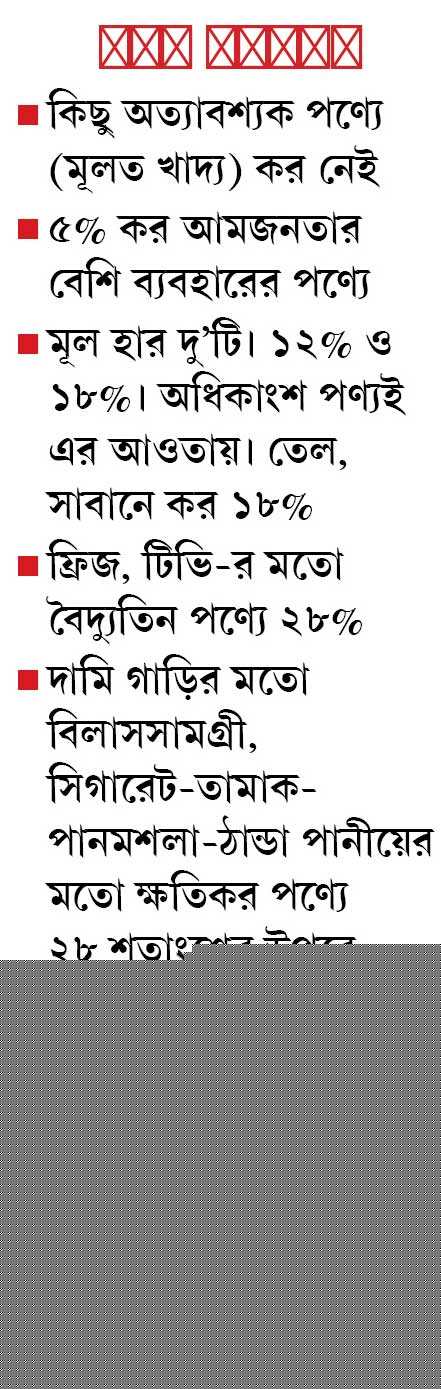 তা ছাড়া জিএসটি চালু হলে, ২৮ শতাংশের থেকেও বেশি ‘কর’ দিতে হবে দামি গাড়ির মতো বিলাস সামগ্রী ও সিগারেট-তামাক-পানমশলা-কোল্ড ড্রিঙ্কের মতো ক্ষতিকর পণ্যে। কারণ, সেখানে ২৮% করের উপরে গুনতে হবে বাড়তি সেস। জিএসটি চালুর পরে প্রথম পাঁচ বছর রাজস্ব কমলে, রাজ্যগুলিকে তা পুষিয়ে দেওয়ার প্রতিশ্রুতি দিয়েছে কেন্দ্র। এই ক্ষতিপূরণ গুনতে বছরে লাগবে ৫০ হাজার কোটি। সেই টাকা জোগাড় করতেই ওই সেস বসানোর সিদ্ধান্ত বলে দাবি করেছিল কেন্দ্র।