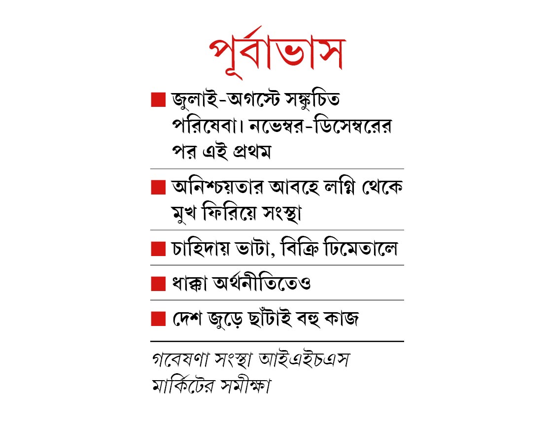 পরিষেবা ক্ষেত্রের সঙ্কোচন ধাক্কা দিচ্ছে অর্থনীতির ভিতেও। উৎপাদন শিল্প এবং পরিষেবা মিলিয়ে তৈরি সার্বিক সূচক (নিক্কেই ইন্ডিয়া কম্পোজিট পিএমআই আউটপুট ইনডেক্স) জুলাইয়ে ছিল ৪৬। একশো মাসে সবচেয়ে নীচে। অগস্টে তা হয়েছে ৪৯। মূলত পরিষেবায় ধাক্কার কারণেই তা ৫০ পেরিয়ে বৃদ্ধির মুখ দেখেনি বলে সমীক্ষায় ইঙ্গিত।