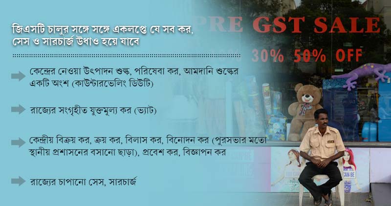 আছে রাজ্যের সংগৃহীত যুক্তমূল্য কর (ভ্যাট), কেন্দ্রীয় বিক্রয় কর, ক্রয় কর, বিলাস কর, বিনোদন কর (পুরসভার মতো স্থানীয় প্রশাসনের বসানো ছাড়া), প্রবেশ কর, বিজ্ঞাপন কর ইত্যাদিও। উঠে যাবে রাজ্যের চাপানো সেস, সারচার্জও। এখন এই সবকিছুর আওতায় যা যা পড়ে, তার প্রায় সবই ঢুকবে জিএসটি-র চৌহদ্দিতে।