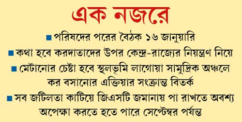 ঐকমত্য এখনও অধরা মূলত দু’টি জায়গায়। এক, করদাতাদের উপর নিয়ন্ত্রণ। দুই, রাজ্যের স্থলভূমি লাগোয়া সামুদ্রিক অঞ্চলে লেনদেন হওয়া পণ্যে কর বসানোর অধিকার হাতে রাখা। যে- কারণে ১৬ জানুয়ারি ফের বৈঠকে বসে পরিষদ এই সমস্ত বিষয় চূড়ান্ত করার চেষ্টা করবে বলে জানিয়েছেন জেটলি।