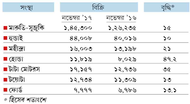 বাজারের জন্য আর একটি ভাল খবর হল, নভেম্বরে গাড়ি বিক্রি বেশ আকর্ষণীয় হারে বৃদ্ধি। মারুতি-সুজুকির বিক্রি বেড়েছে ১৫% হারে। সংস্থাটির মোট বিক্রি দাঁড়িয়েছে ১,৪৫,৩০০টি গাড়ি। ভাল রকম বিক্রি বেড়েছে হুন্ডাই, মহীন্দ্রা, হোন্ডা, টাটা মোটরস, টয়োটা, ফোর্ড— অর্থাৎ প্রায় সবা সংস্থারই। এটিকে অর্থনীতির চাকা কিছুটা ঘোরার ইঙ্গিত বলে মনে করছেন অনেকে।