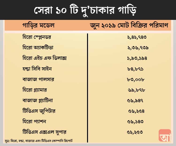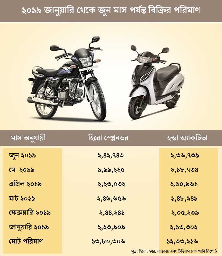 জানুয়ারি থেকে জুন—মোট ১৩ লক্ষ ৮০ হাজার ৩০৬টি হিরো স্প্লেন্ডর বিক্রি হয়েছে। সেখানে হন্ডা অ্যাকটিভা বিক্রির পরিমাণ ১২ লক্ষ ৩৩ হাজার ২১৬টি। যদিও মে মাসে অ্যাকটিভা কিছুটা এগিয়ে ছিল, স্প্লেন্ডরের থেকে। তবুও অ্যাকটিভা ভারতীয় দু’চাকার বাজারে এই ছয় মাসে প্রথম স্থান নিতে পারেনি।