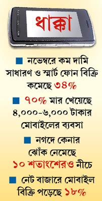 বিশেষজ্ঞ সংস্থা কাউন্টার পয়েন্ট রিসার্চ-এর তথ্য বলছে, কম দামি স্মার্ট ফোন ও ফিচার বা সাধারণ ফোন মিলিয়ে ৩৪% বিক্রি কমেছে নভেম্বরে। তবে সংশ্লিষ্ট শিল্পমহলের হিসেব, সবচেয়ে বেশি মার খাচ্ছে ৪০০০ থেকে ৬০০০ টাকার মোবাইল। প্রায় ৭০% নেমেছে সেগুলির বিক্রি।