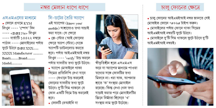 • যে মোবাইলটির সম্পর্কে তথ্য দরকার সেটির আইএমইআই নম্বর এসএমএস করতে হবে। অ্যাপ ব্যবহার করে আগাম যাচাইয়ের ব্যবস্থাও (নো ইওর মোবাইল পরিষেবা) চালু করা যেতে পারে।