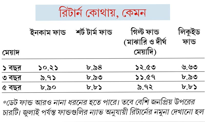 • বাজারে বিভিন্ন ধরনের ডেট ফান্ড রয়েছে। কিছু স্বল্প মেয়াদে টাকা রাখার পক্ষে উপযোগী। কিছু দীর্ঘ মেয়াদের জন্য। যাঁর যেমন দরকার, সেই অনুযায়ী বিভিন্ন মেয়াদের নানা রকম ফান্ডের মধ্যে থেকে নিজের পছন্দসইটি বেছে