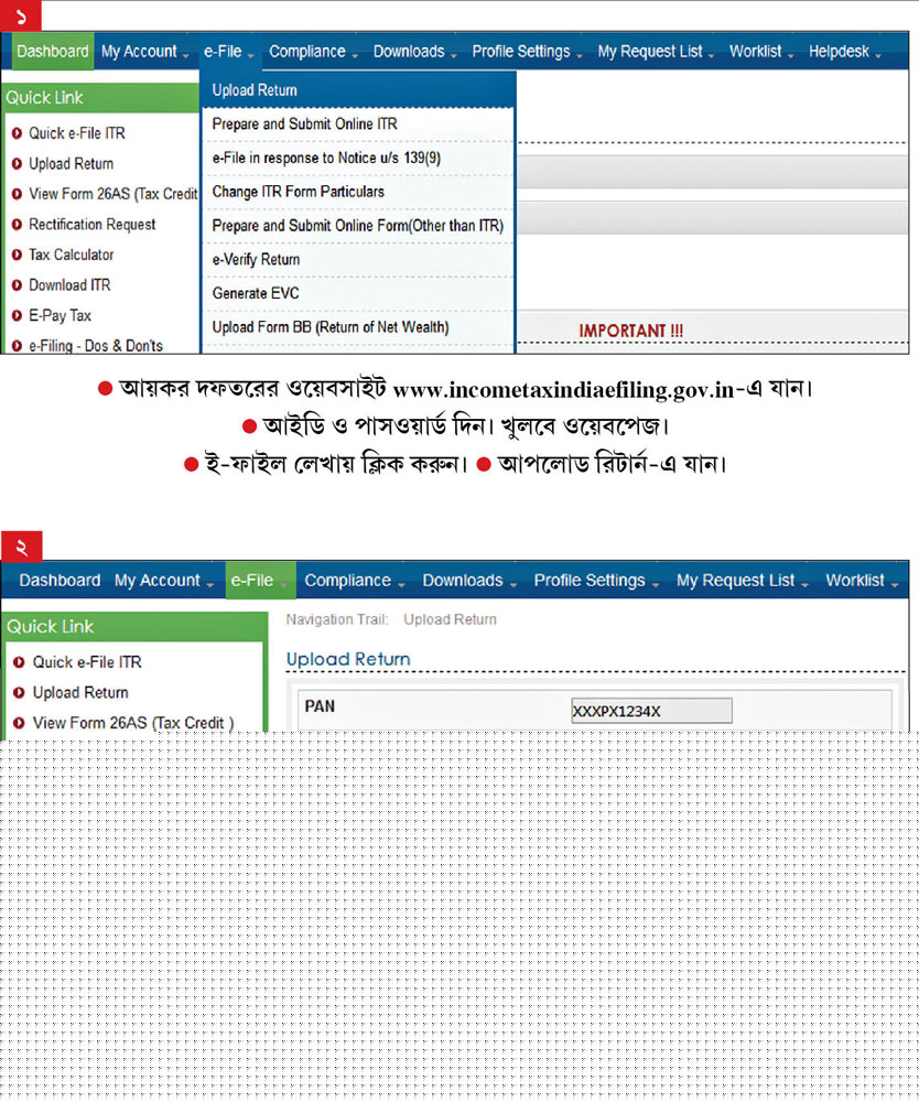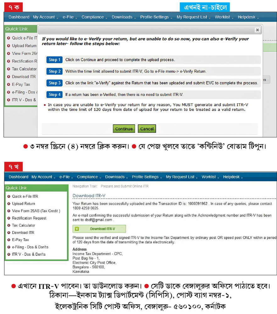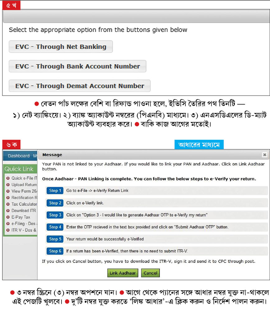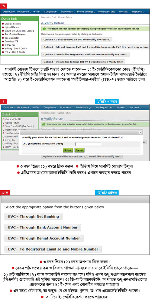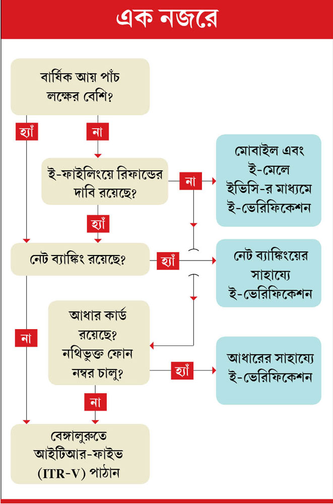 আবার আয় ৫ লক্ষ টাকা বা তার নীচে হলে এবং রিফান্ডের ব্যাপার না-থাকলে, ই-ফাইলিং বাধ্যতামূলক নয়। কিন্তু রিফান্ডের বিষয়টি থাকলে, আয় যা-ই হোক, ই-ফাইলিং করতে হবে। এর পরই আসবে রিটার্ন ভেরিফিকেশনের প্রসঙ্গ।