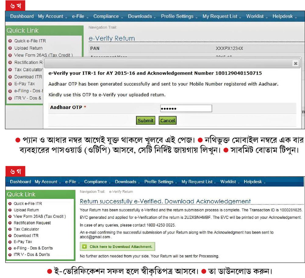 মোবাইলে আসা ‘ওয়ান টাইম পাসওয়ার্ড’ (ওটিপি) ব্যবহার করে তা করতে চাইলে থাকতে হবে আধার কার্ড। না-থাকলেও তা করা যাবে ইন্টারনেট ব্যাঙ্কিং, ব্যাঙ্ক অ্যাকাউন্ট, ডি-ম্যাট অ্যাকাউন্ট, এটিএম কিংবা ই-মেল ব্যবহার করে। আয় পাঁচ লক্ষ টাকা পর্যন্ত হলে এবং টাকা ফেরতের (রিফান্ড) ব্যাপার না-থাকলে, ভেরিফিকেশন ই-মেল এবং মোবাইল নম্বর ব্যবহার করেই করা যায়। তবে কর জমা বা রিটার্ন নিয়ে দফতরের প্রশ্ন থাকলে, তারা ভেরিফিকেশনের অনুমতি না-ও দিতে পারে।
