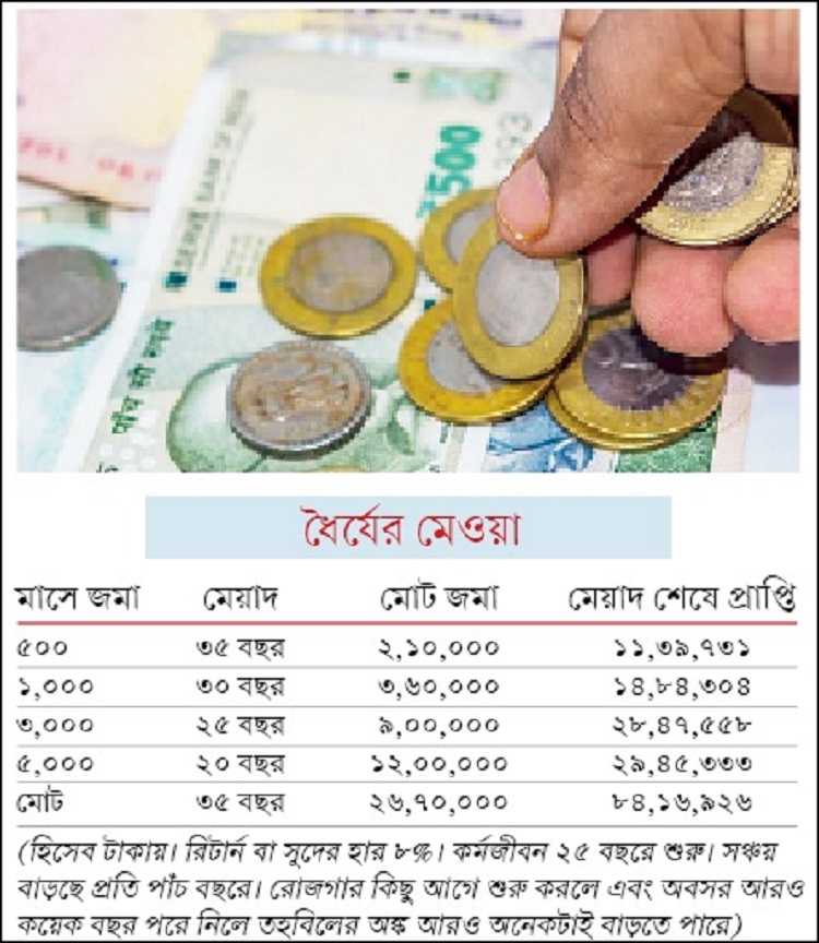অর্থাৎ, বাস্তব অবস্থার কথা মাথায় রেখে সময় থাকতেই নিজের এবং পরিবারের জন্য করতে হবে প্রয়োজনীয় ব্যবস্থা। তার জন্য গোটা কর্মজীবন ধরে করতে হবে সঞ্চয়। আপনি যদি স্বনির্ভর কিংবা অসংগঠিত ক্ষেত্রের প্রতিনিধি হন, তা হলে জেনে রাখুন অল্প অল্প করে হলেও দীর্ঘ দিন ধরে টাকা জমালে তৈরি হতে পারে বড় অঙ্কের সম্পদ। প্রথাগত প্রভিডেন্ট ফান্ড, গ্র্যাচুইটি, পেনশন আপনার না-ই থাকতে পারে। কিন্তু পরিকল্পনা মাফিক এগোলে আপনিও ওই সব প্রকল্পের বিকল্প ব্যবস্থা করতে পারেন।