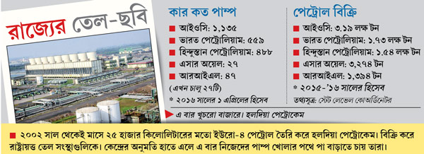 ২০০২ সাল থেকেই মাসে প্রায় ২৫ হাজার কিলোলিটার ইউরো-৪ পেট্রোল তৈরি করে হলদিয়া পেট্রোকেমিক্যালস (এইচপিএল)। এত দিন খুচরো বিক্রির অনুমোদন না-থাকায় রাষ্ট্রায়ত্ত তেল সংস্থাগুলিকে তা বিক্রি করত তারা। কলকাতা ও সংলগ্ন শহরাঞ্চলে ওই সংস্থাগুলির পাম্পে যে ইউরো-৪ পেট্রোল বিক্রি হয়, তার অনেকটাই পেট্রোকেমের তৈরি। সম্প্রতি কেন্দ্রের কাছে পেট্রোলের খুচরো ব্যবসায় নামার অনুমতি চেয়েছিল তারা। অসমর্থিত সূত্রের খবর, সেই অনুমোদনে সই হয়ে গিয়েছে। প্রাথমিক ভাবে ১০০টি পাম্প খোলার অনুমতি দিয়েছে কেন্দ্র।