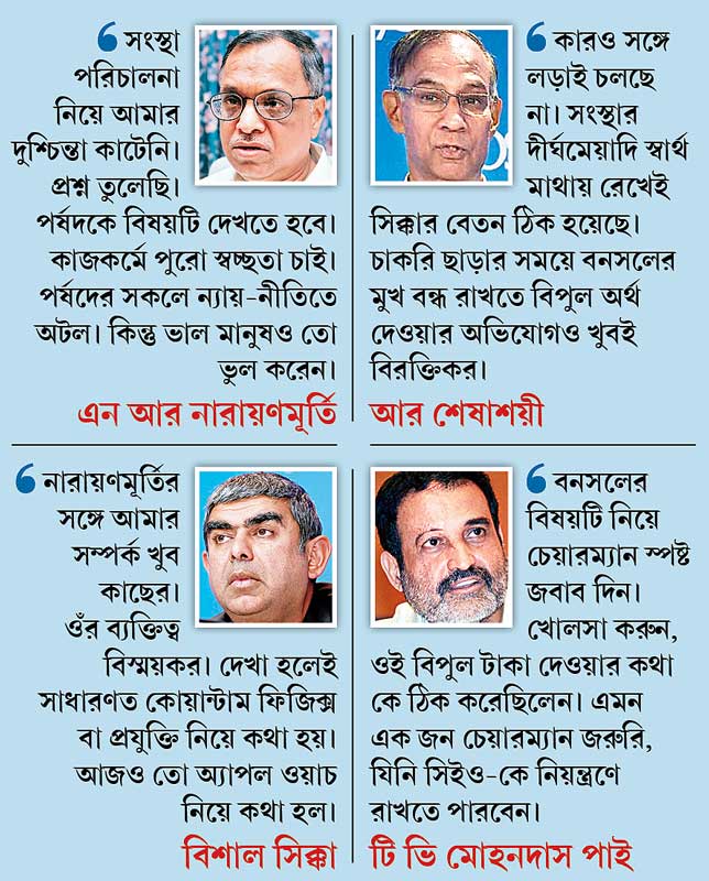 চেয়ারম্যান আর শেষাশয়ীর দাবি, সংস্থার প্রতিষ্ঠাতাদের সঙ্গে পর্ষদের লড়াই সংবাদমাধ্যমের মনগড়া। সিইও-র বিপুল বেতন বৃদ্ধি থেকে সংস্থা ছাড়ার সময়ে প্রাক্তন সিএফও রাজীব বনসলকে আকাশছোঁয়া টাকার প্রতিশ্রুতি— সম্প্রতি ওঠা সমস্ত অভিযোগ নিয়ে উত্তর দিতে এ দিন দীর্ঘ সাংবাদিক সম্মেলনও করলেন তিনি এবং সিক্কা।