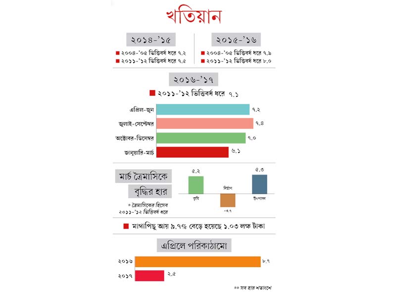 গোটা ২০১৬-’১৭ অর্থবর্ষ ধরলে বৃদ্ধি ৭.১%, তবে তা-ও ছুঁয়েছে গত তিন বছরের তলানি। গত বছরের হার ৮%। কিছুটা মুখরক্ষা করেছে কৃষি। গত বছরে ভাল বর্ষার হাত ধরে ফলন বছরে বেড়েছে ৪.৯% হারে, জানুয়ারি-মার্চে ৫.২%। বিভিন্ন খাতে সরকারি খরচ বাড়ায় আরও বেশি নামতে পারেনি বৃদ্ধি, ধারণা অর্থনীতিবিদদের। কেন্দ্র ভিত্তিবর্ষ ২০০৪-’০৫ থেকে সরিয়ে এনে ২০১১-’১২ ধরাতে তুলনায় বৃদ্ধি কিছুটা বেড়েছে বলে মত বিশেষজ্ঞদের। এ দিনই প্রকাশিত আর একটি পরিসংখ্যানও অর্থনীতির পক্ষে ভাল লক্ষণ নয় বলে তাঁদের ধারণা। এপ্রিলে পরিকাঠামো শিল্পে উৎপাদন বেড়েছে ২.৫%। ২০১৬-র এপ্রিলে যা ছিল ৮.৭%। কয়লা, অশোধিত তেল ও সিমেন্ট উৎপাদন কমায় ঢিমেতালে এগিয়েছে পরিকাঠামো শিল্প।
