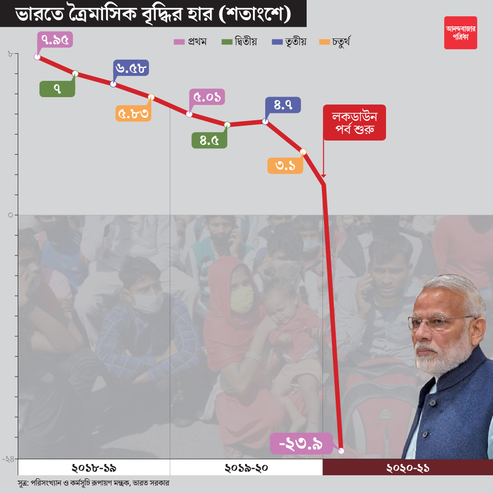 ২০১৯-’২০ অর্থবর্ষের প্রথম ত্রৈমাসিকে (এপ্রিল ২০১৯-মে ২০১৯) আর্থিক বৃদ্ধি আগের বছরের থেকে নেমে দাঁড়ায় ৫.২ শতাংশে। তার পর সেপ্টেম্বরে শেষ হওয়া দ্বিতীয় ত্রৈমাসিকে বৃদ্ধির হার আরও কমে হয় ৪.৪ এবং ২০১৯-এর ৩১ ডিসেম্বর শেষ হওয়া তৃতীয় ত্রৈমাসিকে নেমে যায় ৪.১ শতাংশে। আর শেষ ত্রৈমাসিকে (২০২০-র জানুয়ারি-মার্চ) সেই বৃদ্ধির হার নেমে গিয়েছিল প্রায় ৩ শতাংশে।