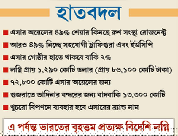 শনিবার গোয়ায় ব্রিক্স গোষ্ঠীর দেশগুলির সম্মেলনে উপস্থিত ছিলেন ভারতের প্রধানমন্ত্রী নরেন্দ্র মোদী এবং রাশিয়ার প্রেসিডেন্ট ভ্লাদিমির পুতিন। সেখানেই এসার অয়েলের সিংহভাগ অংশীদারি (৯৮%) কিনতে চুক্তি করেছে রোজনেফ্ট এবং তার সহযোগী সংস্থা ট্রাফিগুরা ও ইউনাইটেড ক্যাপিটাল পার্টনার্সের (ইউসিপি) কনসোর্টিয়াম। এ জন্য সংস্থাগুলি ঢালছে নগদ ৭২,৮০০ কোটি টাকা। আরও ১৩,৩০০ কোটিতে গুজরাতে দেশের দ্বিতীয় বৃহত্তম বেসরকারি তেল সংস্থাটির ভাদিনার বন্দর প্রকল্পও কিনছে তারা। সব মিলিয়ে লগ্নি ৮৬,১০০ কোটি টাকা (১,২৯০ কোটি ডলার)। যা এখনও পর্যন্ত দেশে আসা বৃহত্তম প্রত্যক্ষ বিদেশি বিনিয়োগ।