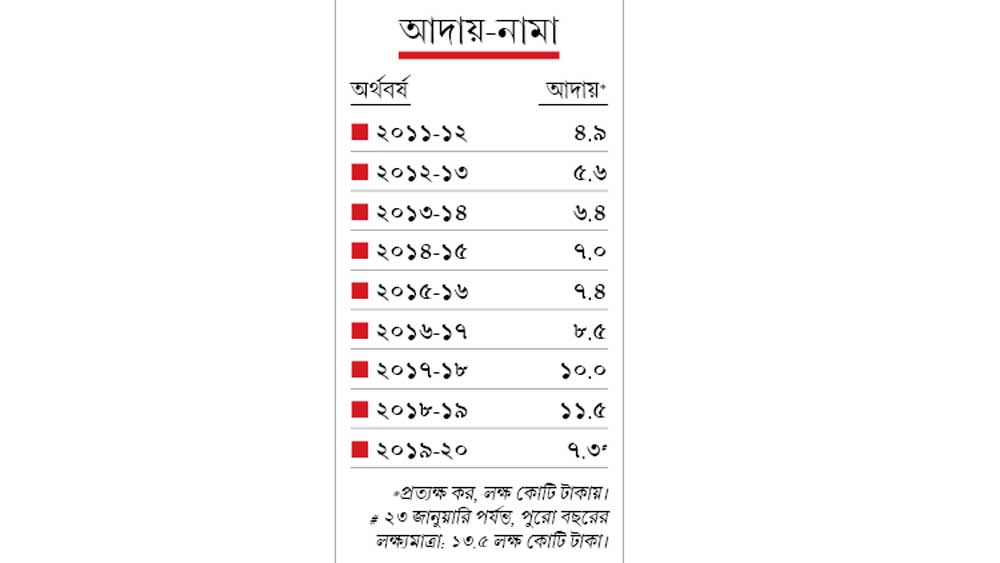 ২০১৮-১৯ সালে প্রত্যক্ষ কর আদায়ের অঙ্ক ছিল ১১.৫ লক্ষ কোটি টাকা। এ বার তা ১৭ শতাংশ বাড়িয়ে লক্ষ্য বাঁধা হয়েছিল ১৩.৫ লক্ষ কোটিতে। কিন্তু এখনও পর্যন্ত যা অবস্থা, তাতে সেই লক্ষ্য ছোঁয়া তো দূর, উল্টে আগের বারের অঙ্কেই পৌঁছনো সম্ভব হবে কি না, সে বিষয়ে সংবাদ সংস্থার কাছে সন্দেহ প্রকাশ করেছেন অর্থ মন্ত্রকের কর্তাদের একাংশ।