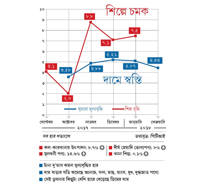 মৃদু মূল্যবৃদ্ধি। আর টগবগে শিল্প। অর্থনীতির চাকায় গতি ফেরাতে যে জোড়া শর্তপূরণ জরুরি, সোমবার যেন ঠিক সেই আদর্শ ছবিই তুলে ধরল কেন্দ্রের পরিসংখ্যান। দেখা গেল, জানুয়ারিতে শিল্পোৎপাদন আগের বছরের একই সময়ের তুলনায় বেড়েছে ৭.৫%। সেই সঙ্গে চার মাসে সব থেকে নীচে নেমে গিয়েছে মূল্যবৃদ্ধির হার। ফেব্রুয়ারিতে দাঁড়িয়েছে ৪.৪৪%। কিন্তু অনেক বিশেষজ্ঞই মনে করিয়ে দিচ্ছেন, শিল্পের এই ভাল পরিসংখ্যান আগের বছরের জানুয়ারির ভিত্তিতে। যখন নোটবন্দির গেরোয় নাকাল ছিল কল-কারখানা। তাই একে শিল্পের হাল ফেরা বলার আগে আর একটু সময় নিতে চান তাঁরা।