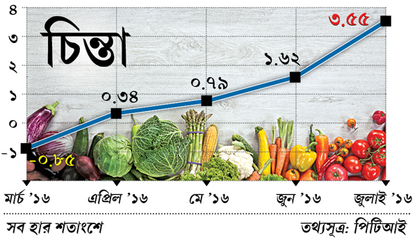 এক ধাক্কায় ২৩ মাসের শিখর ছুঁল পাইকারি বাজারের মূল্যবৃদ্ধি। জুনের ১.৬২% থেকে বেড়ে তা জুলাইয়ে দাঁড়িয়েছে ৩.৫৫%। শিল্পমহলের আশঙ্কা তা ইতিমধ্যেই ৬.০৭ শতাংশে থাকা খুচরো মূল্যবৃদ্ধিকে আরও টেনে তুলবে। বাজার দরে লাগাম পরাতে তাই সরকারি হস্তক্ষেপ দাবি করেছে তারা।