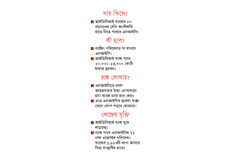 প্রশ্নকে সঙ্গী করেই আইডিবিআই ব্যাঙ্কের শেয়ার কিনতে বুধবার মন্ত্রিসভার সায় পেল এলআইসি। ফলে ব্যাঙ্কটির সিংহভাগ শেয়ার হাতে নিয়ে ব্যাঙ্কিং ক্ষেত্রে পা রাখতে পারবে জীবন বিমা সংস্থাটি। আর আইডিবিআই পাবে ১০,০০০-১৩,০০০ কোটি টাকার পুঁজি। ইতিমধ্যেই ব্যাঙ্কটির ৭.৯৮% শেয়ার রয়েছে এলআইসির হাতে।