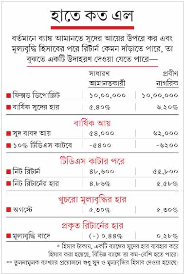 এখন স্টেট ব্যাঙ্ক-সহ বিভিন্ন রাষ্ট্রায়ত্ত এবং অধিকাংশ বেরসকারি ব্যাঙ্কে সর্বোচ্চ সুদ ৫.৫০ শতাংশের আশেপাশে। প্রবীণরা ৭৫ বেসিস পয়েন্ট বেশি পান। বর্তমান নিয়মে আমানতকারীর স্থায়ী আমানতে সুদ বাবদ আয় বছরে ৪০,০০০ টাকার বেশি হলে তাতে টিডিএস (উৎসে কর) কাটে ১০%। বয়স্কদের তা কাটা হয় ৫০,০০০ টাকা পেরোলে। করদাতার কর হিসাব হয় অন্য আয়ের সঙ্গে সুদের রিটার্ন যোগ করার পরে। টিডিএস বাবদ কাটা কর বাদ দিয়ে বছর শেষে তাঁকে যা মেটাতে হয় (আয়ের উপরে প্রযোজ্য করের হার অনুযায়ী)।