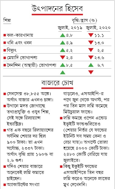 • মার্চ, এপ্রিল, মে, জুনের মতো জুলাইয়েও শিল্পোৎপাদন কমেছে অনেকটা। চাহিদা ও কাজ বাড়ার অন্যতম সূচক কল-কারখানায় উৎপাদন ফের মুখ থুবড়ে পড়েছে। খরচের আগ্রহ মাপার আর এক সূচক, টিভি, ফ্রিজ, ওয়াশিং মেশিনের মতো দীর্ঘমেয়াদি ভোগ্যপণ্যের কেনাকাটা বাড়ার নাম তো নেই-ই, বরং তা তলিয়েছে এতটাই যে উৎপাদন কমেছে প্রায় ২৩%। যদিও আশার কথা, আগের কয়েক মাসের থেকে তুলনায় শিল্পোৎপাদনের হার ভাল। শতাংশের হিসেবে পতনের হার কমেছে। তবে লকডাউন ওঠার পরে শিল্প ঘুরে দাঁড়াতে শুরু করবে বলে যে আশা ছিল, জুলাইয়ে শিল্পের উৎপাদন বুঝিয়েছে সে পথ বহু দূর।