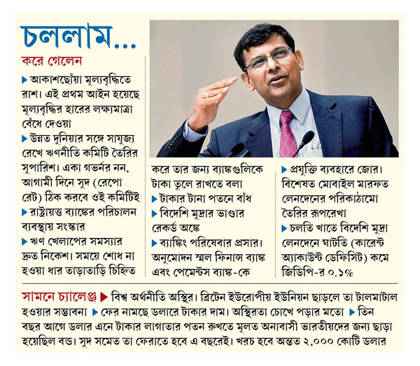 মূল্যবৃদ্ধির লক্ষ্যমাত্রা বাঁধাকে আইনের আওতায় আনা থেকে ঋণনীতি -কমিটি তৈরির সুপারিশ— শিল্পমহলের মতে, দীর্ঘ মেয়াদেও শীর্ষ ব্যাঙ্কের খোলনলচে বদলে যাচ্ছেন রাজন। কিন্তু অস্থির বিশ্ব অর্থনীতি, ইউরোপীয় ইউনিয়ন থেকে ব্রিটেনের বেরোনোর আশঙ্কা বা ডলারে টাকার দর ফের ৭০-এর দিকে ধাওয়া করার এই সময়েই তাঁকে সবচেয়ে বেশি প্রয়োজন ছিল বলে আক্ষেপ করছেন তাঁরা।