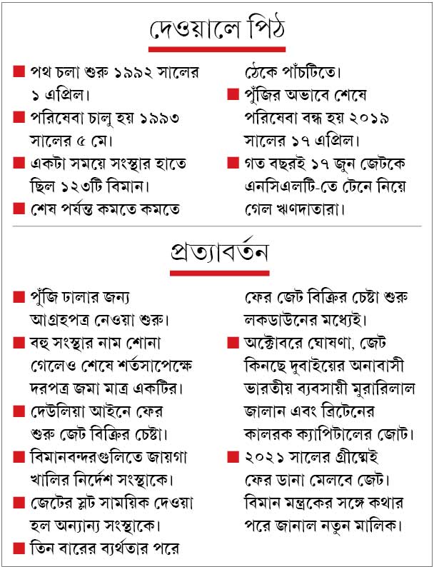 গত বছর থেকে দেউলিয়া আইনে জাতীয় কোম্পানি আইন ট্রাইবুনালে (এনসিএলটি) জেট বিক্রির চেষ্টা চালাচ্ছিল ঋণদাতারা। টানা তিন বার তা ব্যর্থ হওয়ার পরে অবশেষে অক্টোবরে ঘোষণা হয় নতুন মালিকের নাম। তার পর থেকেই কবে ফের জেট ডানা মেলবে, শুরু হয়েছে দিন গোনা। পরিষেবা বন্ধের পরেও জেটের নিজস্ব পাঁচটি বিমান রয়েছে। তাদের লিজ়ে নেওয়া বিমান ভাড়া নিয়েছে অন্যান্য সংস্থা। বিভিন্ন বিমানবন্দরে সংস্থাটির স্লটও (উড়ানের জন্য কেনা নির্দিষ্ট সময়) বাকিরা হাতে নিয়েছে।