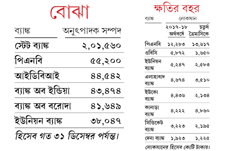 তবে সব থেকে চিন্তায় ফেলেছে রাষ্ট্রায়ত্ত ব্যাঙ্কগুলির বিপুল অনুৎপাদক সম্পদ। অনেকে আবার তাতে সংস্থান করতে গিয়ে গত অর্থবর্ষের চতুর্থ ত্রৈমাসিকে ও পুরো বছরে লোকসানে পড়েছে। কারও ক্ষেত্রে কমেছে নিট মুনাফা (সঙ্গের সারণিতে দেওয়া হল অনুৎপাদক সম্পদ ও ক্ষতির পরিমাণ)। সরকার এই ব্যাঙ্কগুলিতে মোটা টাকা ঢাললেও, তা নিমেষে তলিয়ে যাচ্ছে।