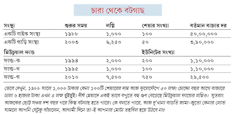 বাস্তব উদাহরণ দেওয়া যাক। ১৯৮৮ সালে একটি মোটরবাইক সংস্থার রাইটস ইস্যুতে ১০০টি শেয়ারে যিনি ১,০০০ টাকা লগ্নি করেছিলেন, তার বর্তমান মূল্য ৫০ লক্ষ টাকা। এমন ঘটনা আরও আছে। বলছি না সব লগ্নিই এমন বাড়বে। সেই আশা করা ঠিকও নয়। তবে ভাল শেয়ারে ছিপ ফেলে ধৈর্য ধরলে বহু ক্ষেত্রেই বড় রুই-কাতলা ওঠে।