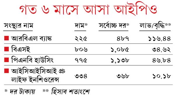 সম্প্রতি বিএসই ইন্ডিয়ার (আগের নাম বম্বে স্টক এক্সচেঞ্জ) আইপিও-তে আবেদন জমা পড়েছিল প্রয়োজনের তুলনায় ৫০ গুণেরও বেশি। ভাল লাভের সুযোগ করে দিয়েছে আরবিএল ব্যাঙ্ক, পিএনবি হাউসিং ফিনান্স, বিএসই ইন্ডিয়া, আইসিআইসিআই প্রু ইনশিওরেন্স-সহ বেশ কিছু সংস্থা। সঙ্গের সারণিতে দেওয়া হল কিছু তথ্য।