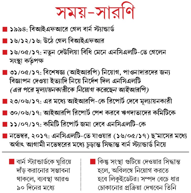 বিআইএফআর উঠে যাওয়ার পরে নতুন দেউলিয়া বিধি মেনে মে মাসে ন্যাশনাল কোম্পানি ল ট্রাইব্যুনালে (এনসিএলটি) গিয়েছে বার্ন স্ট্যন্ডার্ড। নভেম্বরের মধ্যে সংস্থার বিষয়ে চূড়ান্ত সিদ্ধান্ত জানাবে তারা। কিন্তু তার জন্য একের পর এক ধাপ পেরনো শুরু হয়েছে ইতিমধ্যে। এই কাজে বিশেষজ্ঞ (ইন্টেরিম রেজলিউশন প্রফেশনাল বা আইআরপি) নিয়োগের নির্দেশ দেওয়া হয়েছে। বলা হয়েছে পাওনাদারদের জন্য বিজ্ঞাপনের কথা। এ বার একের পর এক যে সমস্ত রিপোর্টের ভিত্তিতে সিদ্ধান্ত হবে, তা-ও জমা পড়তে শুরু করার কথা চলতি সপ্তাহ থেকেই।
