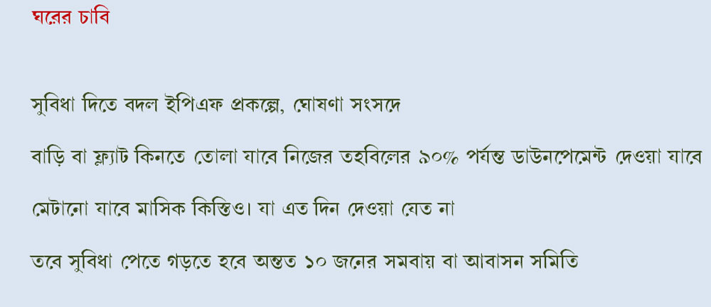 বুধবার রাজ্যসভায় এক প্রশ্নের লিখিত জবাবে শ্রমমন্ত্রী বন্দারু দত্তাত্রেয় জানান, পিএফের প্রায় ৪ কোটি সদস্যের সামনে এই আবাসন প্রকল্পের সুবিধার দরজা খুলে দিতে তাতে প্রয়োজনীয় পরিবর্তন করা হবে। এ কথা অবশ্য আগেই জানিয়েছিলেন পিএফ কর্তৃপক্ষ। মন্ত্রীর দাবি, বাড়ি বা ফ্ল্যাট কিনতে নিজের তহবিলের ৯০% পর্যন্ত টাকা তুলে নেওয়া যাবে। বাড়ি কিনতে শুরুতে প্রয়োজন হওয়া থোক টাকা (ডাউনপেমেন্ট) তো মেটানো যাবেই, দেওয়া যাবে মাসিক কিস্তিও (ইএমআই)। যে সুবিধা আগে ছিল না।