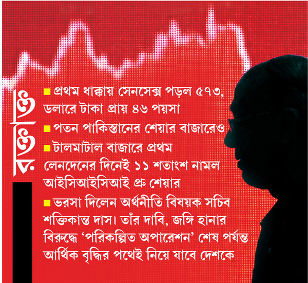 বাজারের হাল ফেরাতে সাহায্য করে কেন্দ্রের অর্থনীতি বিষয়ক সচিব শক্তিকান্ত দাসের মন্তব্য। এক টুইট বার্তায় তাঁর দাবি, জঙ্গি হানার বিরুদ্ধে ‘পরিকল্পিত অপারেশন’ শেষ পর্যন্ত বৃদ্ধিতে ইন্ধন জুগিয়ে আর্থিক স্থিতির পথেই নিয়ে যাবে ভারতকে। স্টেট ব্যাঙ্ক অব ইন্ডিয়া তার রিপোর্ট ‘ইকোর‌্যাপ’ -এ বলেছে, বাজারে বড়সড় প্রভাব ফেলবে না ভারতীয় সেনার এই অপারেশন। কারণ, ভারতের আর্থিক ভিত যথেষ্ট জোরালো। রিপোর্ট উল্লেখ করেছে, কার্গিল যুদ্ধের সময়েও প্রথমে বাজার পড়ে যায়। পরে ধাক্কা কাটিয়ে ওঠে সূচক।