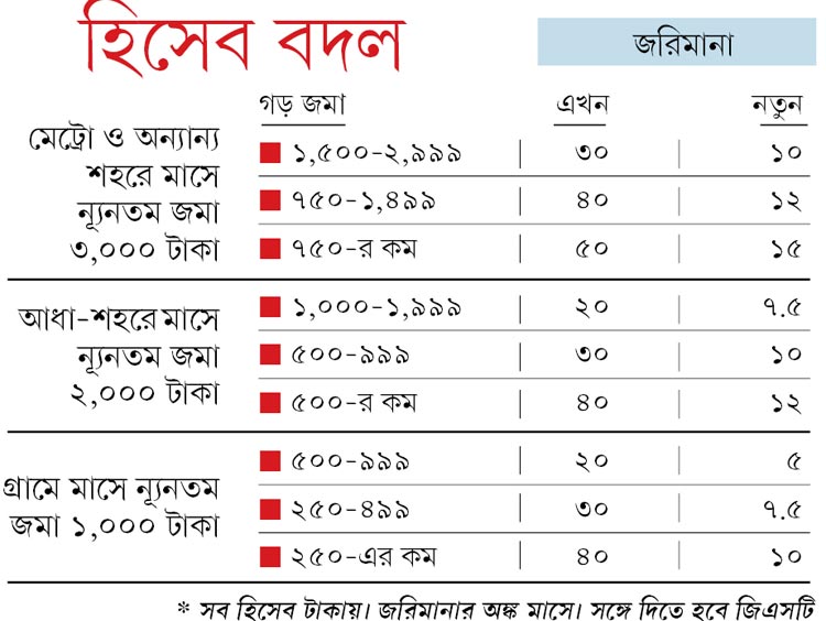সেভিংস অ্যাকাউন্টে ন্যূনতম টাকা জমা (মিনিমাম ব্যালান্স) না রাখলে গুনতে হওয়া জরিমানার অঙ্ক ৭৫% পর্যন্ত কমিয়ে দিল স্টেট ব্যাঙ্ক। এখন জরিমানা মাসে ২০ থেকে ৫০ টাকা পর্যন্ত। কিন্তু আগামী ১ এপ্রিল থেকে তা কমিয়ে ৫ থেকে ১৫ টাকার মধ্যে রাখছে তারা। তবে শহর, আধা শহর বা গ্রাম— কোথাও ওই ন্যূনতম জমার পরিমাণ কমায়নি দেশের বৃহত্তম ব্যাঙ্কটি। উল্লেখ্য, গত এপ্রিল থেকে এ বছরের ৩১ জানুয়ারি পর্যন্ত মাসে গড় ন্যূনতম জমা না থাকায় ৪১.১৬ লক্ষ সেভিংস অ্যাকাউন্ট বন্ধ করেছে তারা।