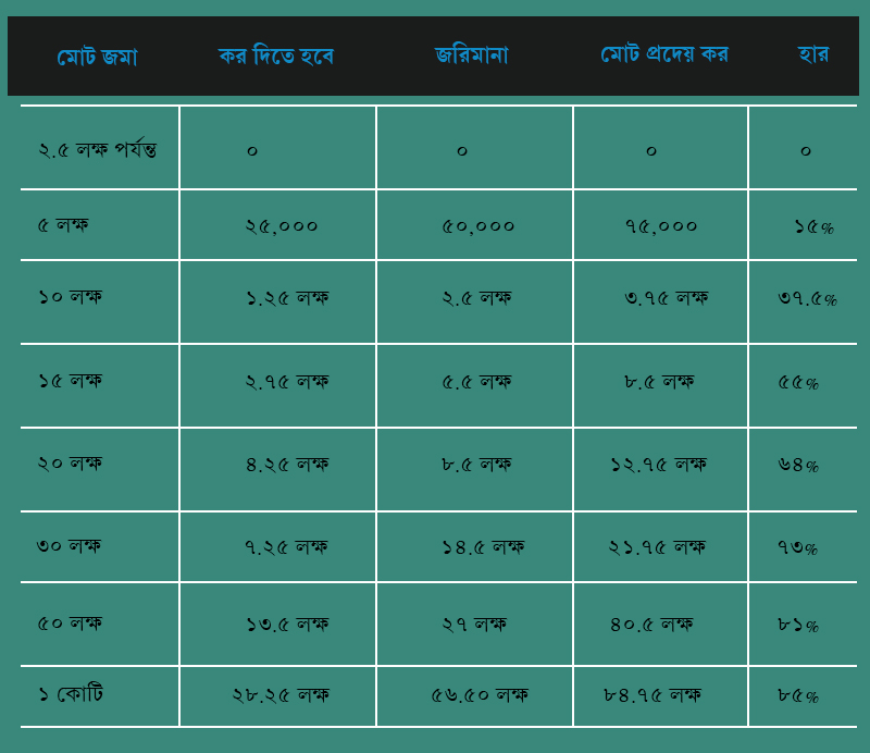 আয়কর দফতরের এক অফিসার জানান, “সত্ ভাবে যাঁরা আয়কর দেখিয়ে এসেছেন, ২.৫ লক্ষর বেশি টাকা তাঁরা নির্দ্বিধায় জমা দিতে পারেন। তবে আয়ের উত্স-র যথাযথ কারণ দেখাতে হবে।” আয়কর অ্যাক্ট অনুযায়ী, ২৭০ (এ)-র নতুন ধারায় বলা হয়েছে, আয়করে দেখানো হয়নি এমন অর্থ জমা করলে, শাস্তি হিসাবে ২০০ শতাংশ কর গুনতে হবে। অর্থাত্ ৩ থেকে ৫ লক্ষ নগদ টাকা জমা করতে গেলে ১৫ শতাংশ বেশি কর গুনতে হবে। আর যদি ২০ লক্ষ নগদ টাকা জমা করলে, কর দিতে হবে ৬৩.৫ শতাংশ। এর সঙ্গে আয়কর দফতরের নজরেও পড়তে পারেন করদাতারা।