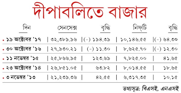 গুজরাতি নববর্ষ এবং ভ্রাতৃদ্বিতীয়া উপলক্ষে আজ শেয়ার বাজার বন্ধ থাকবে। তারপর শনি ও রবিবার লেনদেন বন্ধ থাকায়, টানা তিন দিন পরে সোমবার ফের তা খুলবে।