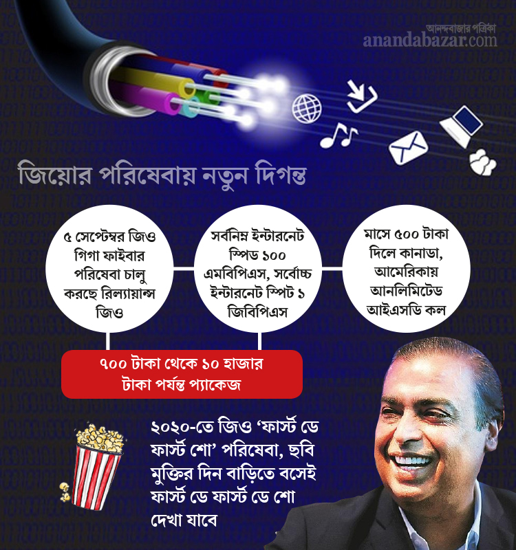 জিয়ো গিগা ফাইবার পরিষেবা নিয়ে এ দিন মুকেশ অম্বানী বলেন, ‘‘আগামী ৫ সেপ্টেম্বর জিয়ো-র তিন বছর পূর্তি। ওই দিনই জিয়ো গিগা ফাইবার পরিষেবা চালু করতে চলেছি আমরা। এতে ১০০ এমবিপিএস থেকে ১ জিবিপিএস পর্যন্ত গতিতে ইন্টারনেট পরিষেবা মিলবে।’’