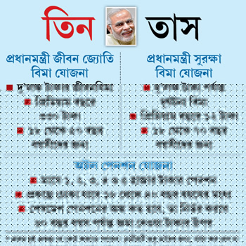 প্রধানমন্ত্রী জীবন জ্যোতি বিমা যোজনা, প্রধানমন্ত্রী সুরক্ষা বিমা যোজনা, এবং অটল পেনশন যোজনা। ২৬মে সরকারের প্রথম বর্ষপূর্তির মুখে দাঁড়িয়ে এই তিন সামাজিক সুরক্ষা প্রকল্প ঘোষণা করবেন মোদী। তাঁর জমানায় এই প্রথম। মূল লক্ষ্য, সামান্য টাকায় সাধারণ মানুষকে বিমা ও পেনশনের সুবিধা দেওয়া। অনেকেই বলছেন, জমি-বিল নিয়ে সরকারকে কোণঠাসা করতে চাইছেন বিরোধীরা। লেপ্টে দিতে চাইছেন গরিব-বিরোধী তকমা। মোদী-সরকারকে ‘স্যুট-বুটের সরকার’ বলে প্রতিপন্ন করতে উঠে পড়ে লেগেছেন সনিয়া ও রাহুল গাঁধী। ফলে এই পরিস্থিতিতে আমজনতার জন্য গত এক বছরে কী কী কাজ হয়েছে, তা সামনে রেখেই প্রচারে যেতে চাইছেন নরেন্দ্র মোদী। আর সেই কারণেই এই তিন সামাজিক সুরক্ষা প্রকল্পকে সফল করতে প্রায় পুরো প্রশাসনকেই কাজে নামিয়েছেন মোদী।