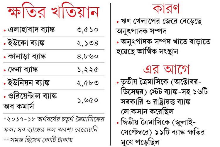 গত অর্থবর্ষের চতুর্থ ত্রৈমাসিকে একের পর এক রাষ্ট্রায়ত্ত ব্যাঙ্ক ক্ষতি গুনেছে। আর তাতেই প্রশ্নের মুখে পড়েছে নরেন্দ্র মোদী সরকার। জানুয়ারি থেকে মার্চ— এই তিন মাসে ইউনিয়ন ব্যাঙ্ক, এলাহাবাদ ব্যাঙ্ক, ইউকো ব্যাঙ্ক, কানাড়া ব্যাঙ্ক, দেনা ব্যাঙ্ক ও ওরিয়েন্টাল ব্যাঙ্ক অব কমার্সের মোট লোকসানের পরিমাণ দাঁড়িয়েছে ১৫,৯৬২ কোটি টাকা।