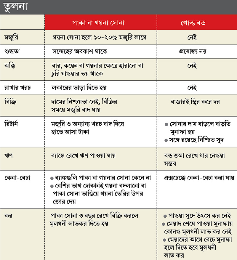 • মেয়াদের আগে বন্ড বেচার সময়ে সোনার দাম বাড়লে অবশ্য দিতে হবে মূলধনী লাভকর।
