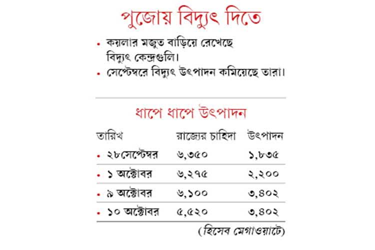 সেই অনুযায়ী, পশ্চিমবঙ্গ বিদ্যুৎ উন্নয়ন নিগম ও পশ্চিমবঙ্গ রাজ্য বিদ্যুৎ বণ্টন সংস্থা পারস্পরিক বোঝাপড়ায় বিদ্যুৎ কেন্দ্রগুলিতে ধাপে ধাপে কয়লার মজুত অনেকটাই বাড়িয়েছে। বিদ্যুৎমন্ত্রী জানিয়েছেন, কোল ইন্ডিয়া এখন প্রতিদিন প্রায় ১৪ রেক করে কয়লা পাঠাচ্ছে। ফলে পুজোর সময়ে বিদ্যুতের চাহিদা মেটাতে পর্যাপ্ত কয়লা বিদ্যুৎ কেন্দ্রগুলিতে মজুত হচ্ছে। অন্য দিকে, সেপ্টেম্বরের শেষের দিকে চাহিদা থাকলেও নিগম কম বিদ্যুৎ উৎপাদন করেছে। ঘাটতি মেটাতে বাজার থেকে বেশি দামেই বিদ্যুৎ কিনে গ্রাহকদের চাহিদা মিটিয়েছে বণ্টন সংস্থা। রাজ্যের বিদ্যুৎ কর্তারা জানাচ্ছেন, পুজোয় বাজার থেকে বিদ্যুৎ কিনে চাহিদা মেটানোর ঝুঁকি বণ্টন কর্তৃপক্ষ নিতে চায়নি। কারণ, কোনও কারণে জাতীয় গ্রিড থেকে দাম দিয়েও বিদ্যুৎ পাওয়া না গেলে পুজোয় ঘাটতি হতে পারে।