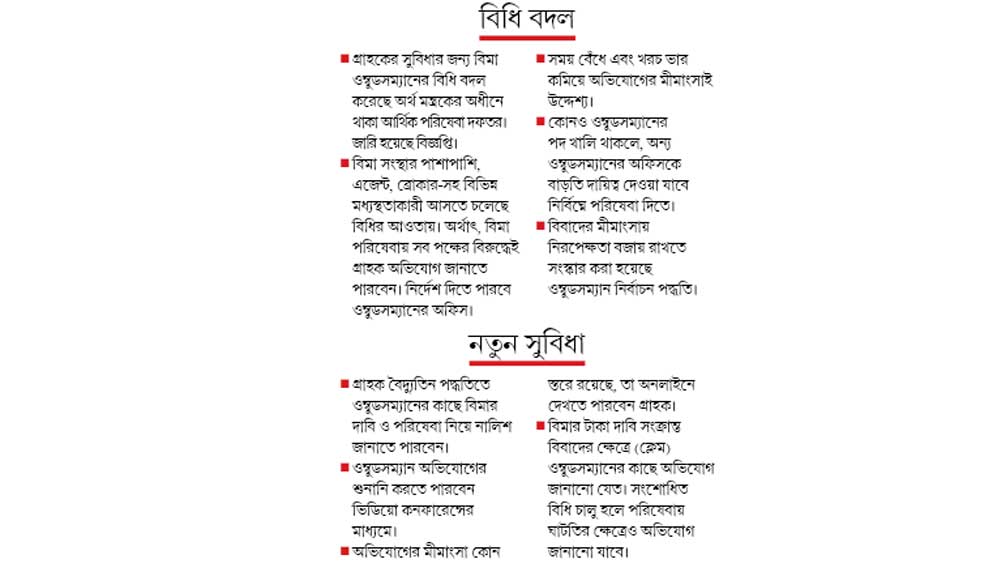 সংশোধনীতে জানানো হয়েছে, বিমা সংস্থা, এজেন্ট বা ব্রোকারদের পরিষেবায় গাফিলতির বিষয়েও ওম্বুডসম্যানের দফতরে অভিযোগ জানাতে পারবেন গ্রাহক। ফলে সংস্থার পাশাপাশি, সমস্ত মধ্যস্থতাকারীও চলে আসছে বিধির আওতায়। অভিযোগের ভিত্তিতে রায় দেবেন ওম্বুডসম্যান। আগে শুধু বিমার দাবি সংক্রান্ত বিবাদ এবং ভুল বুঝিয়ে প্রকল্প বিক্রি বিরুদ্ধে অভিযোগ জানানো যেত।