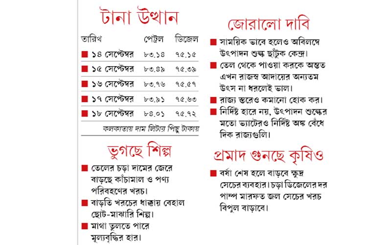 কেন্দ্র বার বার দাবি করছে, ভারতের অর্থনীতির ভিত মজবুত। টাকার দাম পড়া ও পেট্রল-ডিজেলের দর বাড়ার দায় আসলে বিশ্ব বাজারেরই। কিন্তু শিল্পমহলের একাংশ বলছে, দায় থাকুক বা না থাকুক, অবিলম্বে তেলের দাম কমানোর ব্যবস্থা না করলে, আখেরে ধাক্কা খাবে দেশের অর্থনীতিই। কারণ, এর জেরে পণ্য পরিবহণের খরচ ইতিমধ্যে ১০-১৫% বেড়েছে। এ ভাবে চলতে থাকলে জিনিসপত্রের দাম বাড়ার আশঙ্কা। ফলে ভুগবেন আমজনতা। সুদ আরও বাড়বে। সংস্থাগুলির ঋণ জোগাড়ের খরচ বাড়বে। মার খাবে লগ্নি। তাই তাদের দাবি, অন্তত কিছু দিনের জন্য হলেও, অবিলম্বে উৎপাদন শুল্ক কমাক কেন্দ্র। কিছুটা কর ছাঁটুক রাজ্যগুলি। পারলে বদলাক তার কাঠামো। পশ্চিমবঙ্গ, অন্ধ্রপ্রদেশ, কর্নাটকের মতো কিছু রাজ্য অবশ্য ইতিমধ্যে কর কমানোর পথে হেঁটেছে।