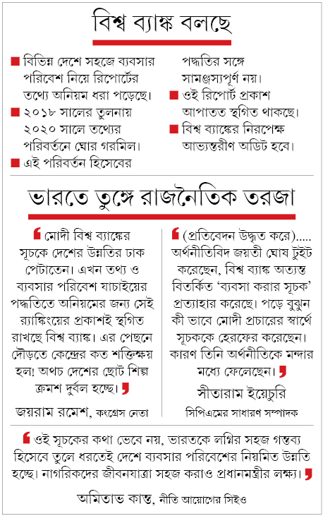 বিশ্ব ব্যাঙ্কের ‘সহজে ব্যবসার পরিবেশ’ (ইজ় অব ডুয়িং বিজ়নেস) সূচকে গত বছর ভারত ১৪ ধাপ এগিয়ে ৬৩ নম্বরে পৌঁছনোকে নিজেদের সাফল্য হিসেবে তুলে ধরে হামেশাই বড়াই করে মোদী সরকার। এ বার র্যাঙ্কিং যাচাইয়ের তথ্যে অনিয়মের কথা জানিয়ে খোদ বিশ্ব ব্যাঙ্ক সেই সূচকের প্রকাশ স্থগিত করতেই, ভারতে বিরোধী রাজনৈতিক দলগুলির কটাক্ষের মুখে পড়ল কেন্দ্র। কোন দেশের তথ্যে গলদ ও হিসেবের পদ্ধতি সামঞ্জস্যহীন, তা বলেনি প্রতিষ্ঠানটি।