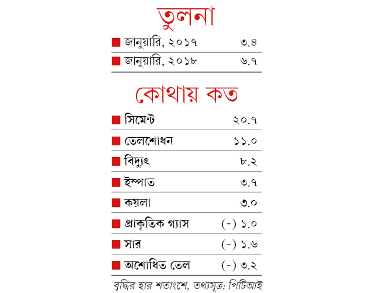 আর্থিক বৃদ্ধির হাল ফেরার দিনেই দেশের আটটি পরিকাঠামো শিল্পের উৎপাদনেও জানুয়ারিতে কিছুটা গতি ফেরার কথা জানাল সরকারি পরিসংখ্যান। ২০১৮-র জানুয়ারিতে এই ক্ষেত্রের বৃদ্ধি ছুঁয়েছে ৬.৭%। ডিসেম্বরে তা ছিল ৪.২%, নভেম্বরে ৭.৪%। গত বছরের জানুয়ারির হার ছিল অনেকটাই কম ৩.৪%।