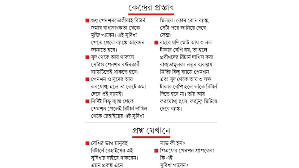 প্রত্যক্ষ কর সংক্রান্ত আইনজীবীদের সংগঠন ডিরেক্ট ট্যাক্স প্রফেশনালস অ্যাসোসিয়েশনের উপস্থাপনা কমিটির চেয়ারম্যান এবং আয়কর বিশেষজ্ঞ নারায়ণ জৈন বলেন, ‘‘অনেকের মধ্যেই বিষয়টি নিয়ে ধোঁয়াশা তৈরি হয়েছে। কেন্দ্রের প্রস্তাব অনুযায়ী শুধু পেনশনভোগীরাই এই ব্যবস্থার সুযোগ নিতে পারবেন। তাঁদের সুদ থেকে আয় থাকতে পারে। তবে দু’টিই এক ব্যাঙ্ক থেকে হতে হবে। অন্য ব্যাঙ্ক বা ডাকঘর থেকে সুদ মিললে এই সুবিধা পাওয়া যাবে না। বাড়ি ভাড়া বা অন্য সূত্র থেকে আয় থাকলেও নতুন ব্যবস্থার সুযোগ পাওয়া যাবে না।’’ ফলে বেশির ভাগ প্রবীণ নাগরিকই রিটার্ন রেহাইয়ের সুবিধা পাবেন না বলে দাবি তাঁর।