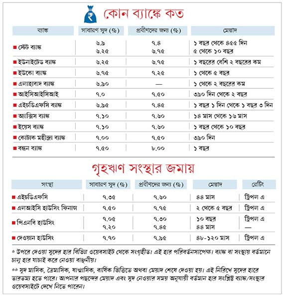 বর্তমান পরিস্থিতিতে যাঁরা সুরক্ষার সঙ্গে সামান্য সমঝোতা করে, একটু বেশি আয়ের জন্য কিছুটা বাইরে বেরোতে চান— তাঁরা গৃহঋণ কোম্পানিগুলোর জমা প্রকল্প একটু নেড়েচেড়ে দেখতে পারেন। এখানে সুদ ব্যাঙ্কের তুলনায় ১ থেকে ১.৫ শতাংশ বেশি হতে পারে। রেটিং দেখে লগ্নি করলে ঝুঁকি বাগে রাখা যায়। সঙ্গের সারণিতে দেওয়া হল কিছু তথ্য।