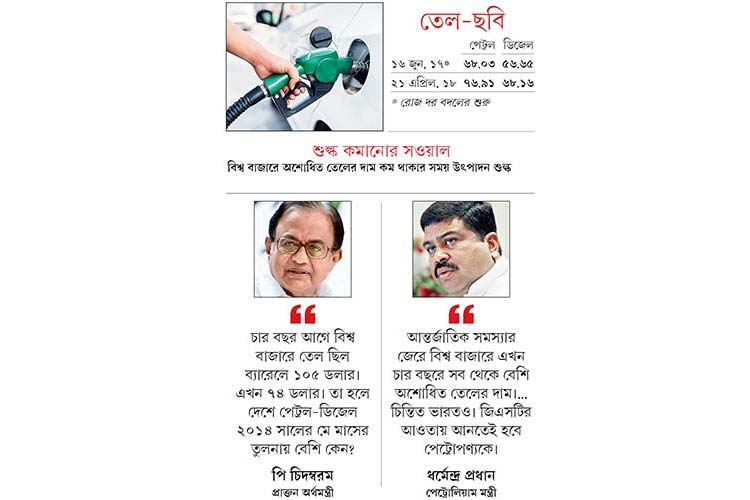 আবার এর আগে তেলমন্ত্রী ধর্মেন্দ্র প্রধান দাবি তুলেছিলেন, রাজ্যগুলি ভ্যাট ছেঁটে তেলের দাম কমাক। পেট্রপণ্যকে জিএসটি-র আওতায় আনা হোক। এ দিনও তেলকে জিএসটিতে সামিলের পক্ষে সওয়াল করেন তিনি। বলেন, ‘‘দাম নিয়ে চিন্তিত সরকার। আমাদের পেট্রপণ্যকে জিএসটির আওতায় আনতেই হবে। কেন্দ্র ও রাজ্যগুলি ধীরে ধীরে সেই দিকেই এগোচ্ছে।’’
