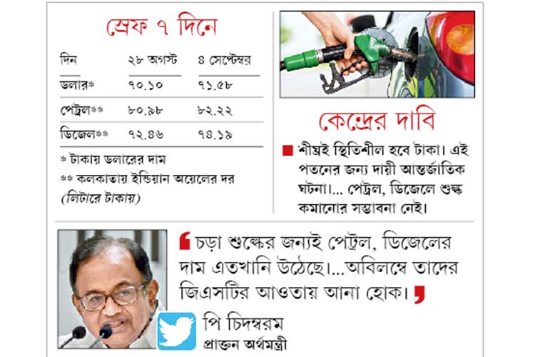 মঙ্গলবারই ৩৭ পয়সা উঠে ডলার পৌঁছেছে রেকর্ড ৭১.৫৮ টাকায়। আর ডলারের গুঁতোয় কলকাতায় লিটারে ৭৪ টাকা ছাড়িয়েছে ডিজেল। পেট্রলও পৌঁছেছে ৮২.২২ টাকায়। এই অবস্থায় টুইটে চিদম্বরমের দাবি, চড়া শুল্কের জন্যই পেট্রল, ডিজেলের দর এত বেশি। তাদের জিএসটিতে আনতে উদ্যোগী হওয়া জরুরি। যদিও আদৌ ক’টি রাজ্য তা মানতে রাজি, তাতে সংশয় যথেষ্ট।