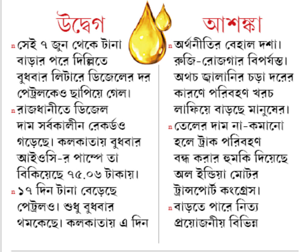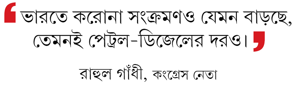 জ্বালানির চড়া দর নিয়ে এ দিনও কেন্দ্রকে এক হাত নেন কংগ্রেস নেতা রাহুল গাঁধী। বলেন, করোনা সংক্রমণ ও জ্বালানির দর— দু’টিকেই ‘আনলক’ করেছে তারা। এর প্রতিবাদে আগামী সোমবার স্বাস্থ্য বিধি মেনেই দেশের সব জেলার সদর দফতরে দু’ঘণ্টার ধর্নায় বসবেন কংগ্রেস সমর্থকেরা। দাবিপত্র দেবেন রাষ্ট্রপতিকে। ক্ষুব্ধ অল ইন্ডিয়া মোটর ট্রান্সপোর্ট কংগ্রেসের দাবি, ট্রাক পরিবহণের ৬৫% খরচই ডিজেলের। ওই জ্বালানির দাম বাড়ায় আয় কমেছে। তাদের হুঁশিয়ারি, ডিজেলের দর না-কমলে ট্রাক চলবে না।